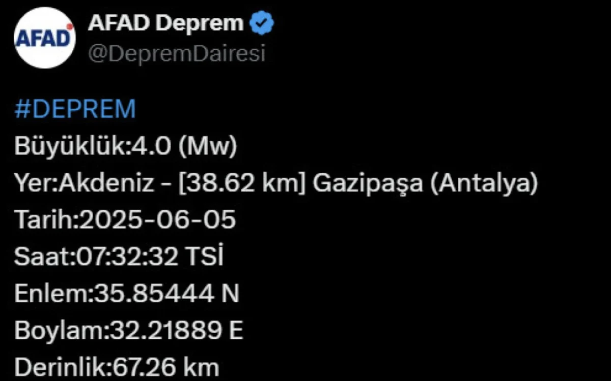 Türkiye bir kez daha güne depremle uyandı. Afet ve Acil Durum Yönetimi Başkanlığı (AFAD), bu sabah iki farklı bölgede art arda meydana gelen depremleri duyurdu. İlk sarsıntı saat 07.32’de Akdeniz’de, Antalya’nın Gazipaşa açıklarında gerçekleşti. Depremin büyüklüğü 4.0 olarak ölçüldü. Kısa bir süre sonra, saat 08.18’de bu kez Ege Denizi’nde Gökçeada açıklarında 4.6 büyüklüğünde bir deprem yaşandı.