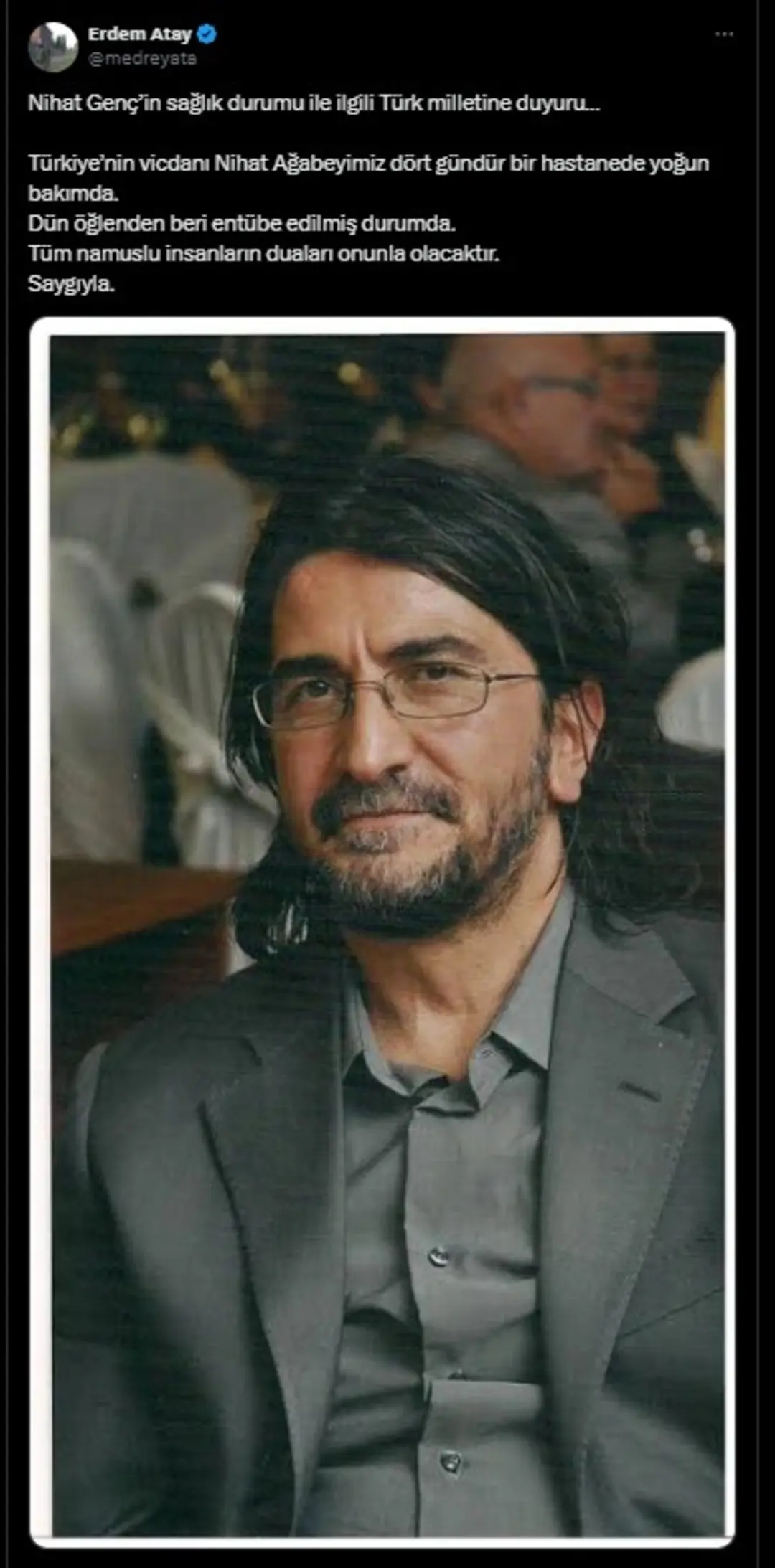 Veryansın TV Genel Yayın Yönetmeni Erdem Atay, Nihat Genç’in sağlık durumu hakkında kamuoyuna bilgi verdi. Sosyal medya üzerinden yaptığı açıklamada şu ifadelere yer verdi: “Türkiye’nin vicdanı Nihat Ağabeyimiz dört gündür bir hastanede yoğun bakımda. Dün öğlenden beri entübe edilmiş durumda. Tüm namuslu insanların duaları onunla olacaktır. Saygıyla.” dedi.