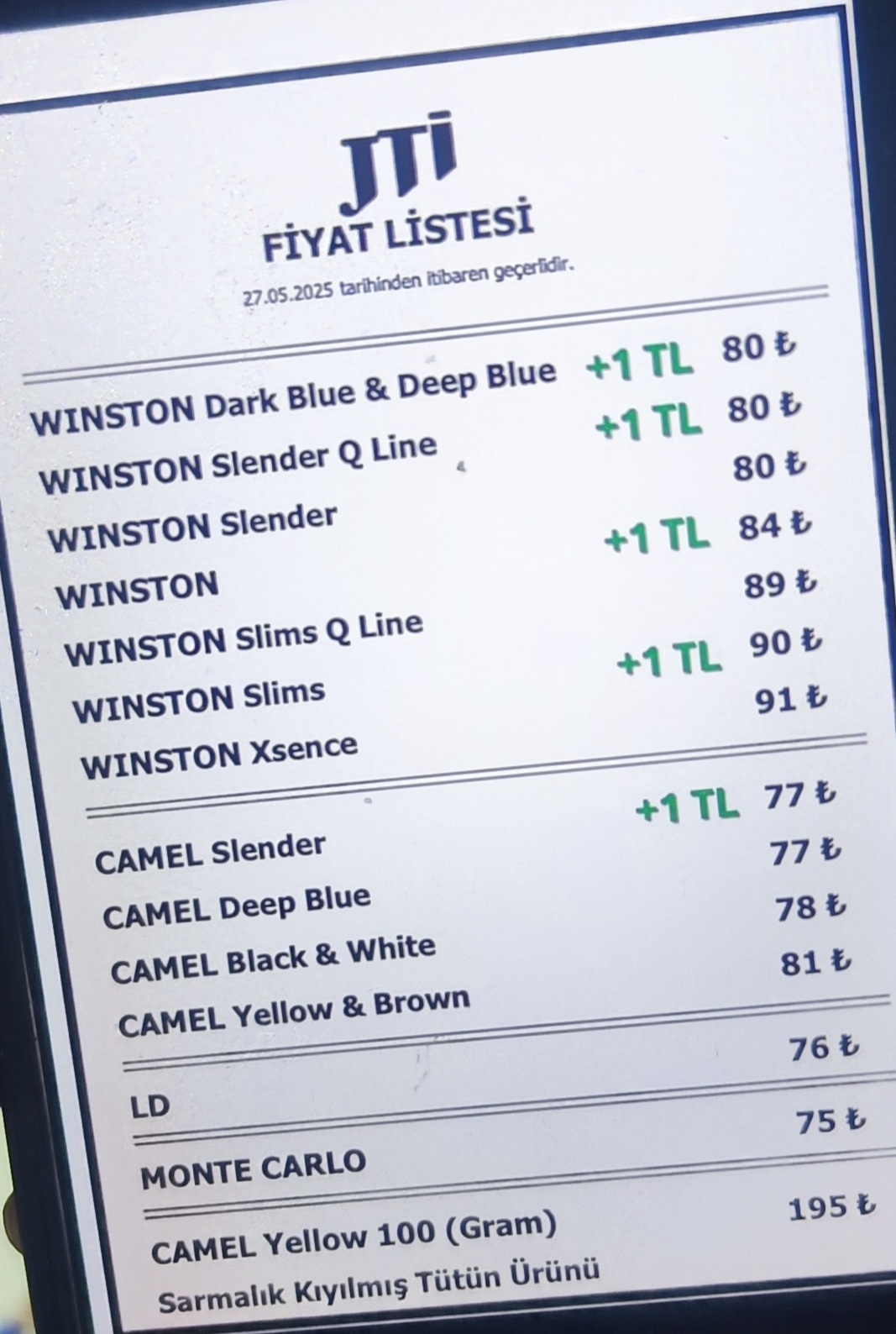 Yapılan zamma göre JTİ grubundaki en ucuz sigara 75 TL’den satışa sunulacak. En yüksek fiyatlı ürün ise 91 TL oldu. Zam sonrası fiyat etiketleri yeniden düzenlenirken, sigara tüketicileri artışa tepkili.