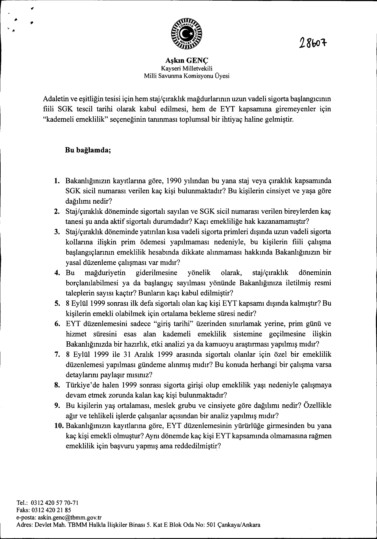 Genç, önergesinde şu ifadelere yer verdi: “Bu insanlar fiilen çalıştı, SGK sicil numarası aldı ama emeklilik hesabında yok sayıldı. Bu hem Anayasa’nın eşitlik ilkesine hem de sosyal devlet anlayışına aykırı.”