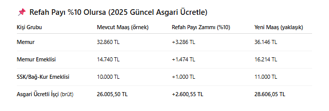 Refah payı, mevcut enflasyon farkına ek olarak verilen, maaşların reel olarak artırılmasını amaçlayan ek zammı ifade ediyor. Temmuz ayında böyle bir uygulama gündeme gelirse, çeşitli gelir gruplarını şu şekilde etkileyebilir: